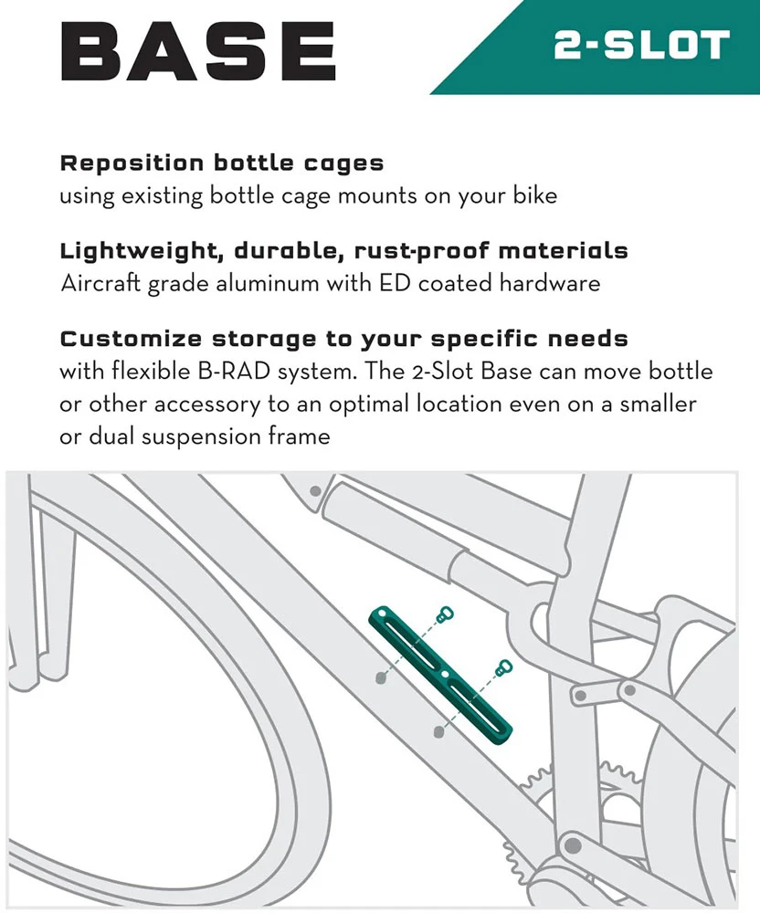 Les bases B-Rad sont la base du système B-RAD, car le reste des accessoires du système y est fixé. Elles permettent de déplacer les bidons pour faire de la place aux sacoches de cadre, de retirer les bidons des amortisseurs et de faire de la place pour des bidons et/ou des sacoches supplémentaires sur le même porte-bidon.