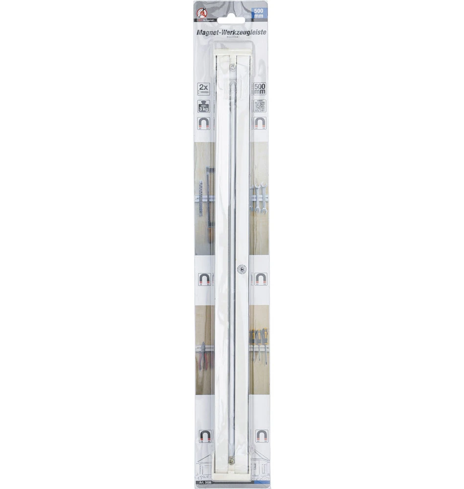 La barre à outils magnétique BGS technic d’une longueur de 500 mm est une barre peinte avec des vis pour la fixation murale et une capacité de charge allant jusqu’à 3 kg.