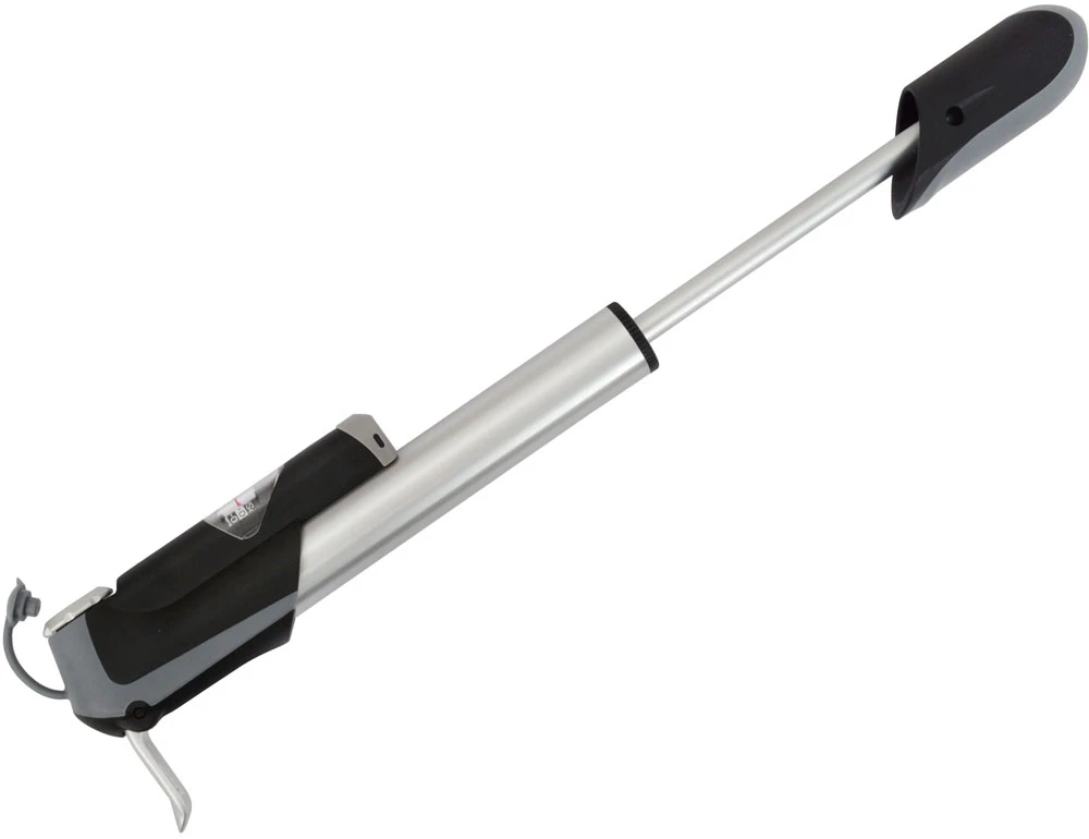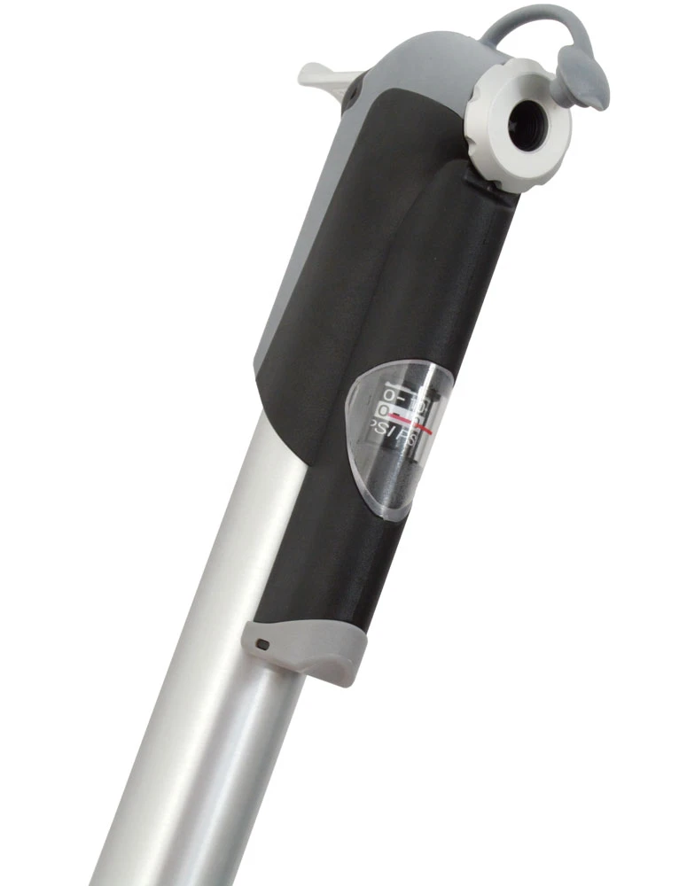 Pompe légère avec manomètre et raccord de valve pour AV et SV. Idéale pour les vélos de randonnée et les VTT – grâce à un grand volume par course. Poignée à l’ergonomie optimale.