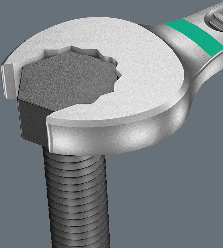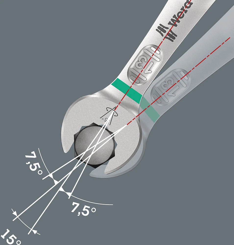 La clé mixte Joker6003 avec la forme particulière de sa fourche 12 pans et coudée à 7,5° double les possibilités d’ancrage lors de la rotation à 180° répétée de la clé dans l’axe longitudinal. Les écrous ou têtes de vis peuvent être «agrippés» tous les 15°. La Joker6003 trouve pour ainsi dire d’elle-même le point d’ancrage suivant à chaque rotation.